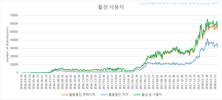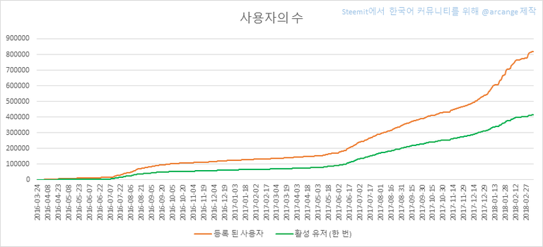녹색선은 그 중 얼마나 많은 계정이 한번이라도 활성화 되었는지 나타냅니다. (활성화는 단 한번이라도 글, 댓글 또는 업보트를 한 계정을 말합니다.) 그들은 그들이 나중에 비활성화 될 경우에도 포함되어 있습니다.