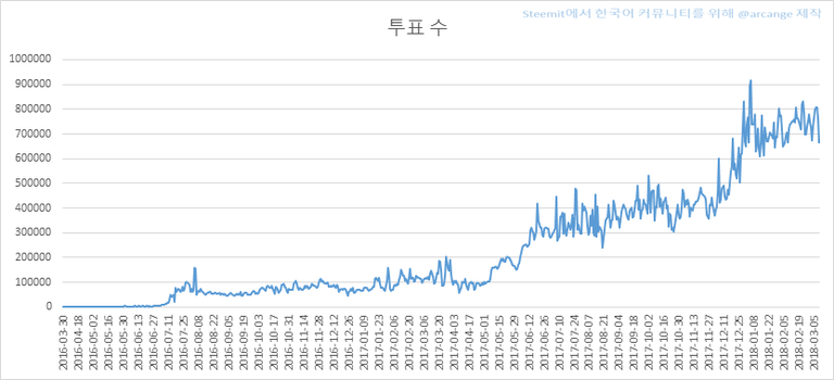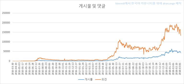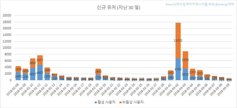 이 그래프는 스팀잇에 새로 가입한 유저 숫자와 그 중에서 얼마나 활성화가 되었는지 알려줍니다. 많은 유저들이 가입은 하지만, 실제로 사용되지는 않는다는 걸 볼 수 있습니다.
