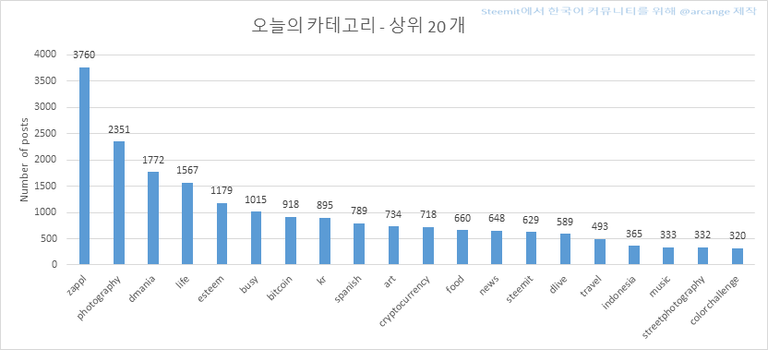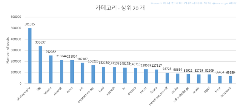 이 그래프는 전체 기간 중 상위 20개 카테고리의 게시글 숫자를 보여줍니다.