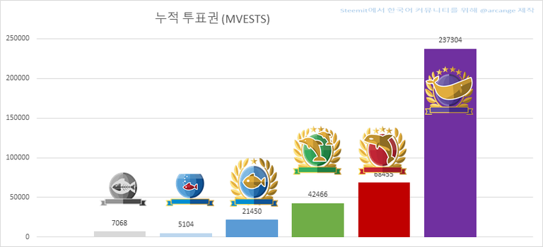 이 그래프는 보팅 파워의 분포도를 보여줍니다. (비활성화 유저와 빨간 물고기 레벨이 포함되어 있습니다. 더 많은 정보는 @steemitboard 블로그를 참고해주세요.).