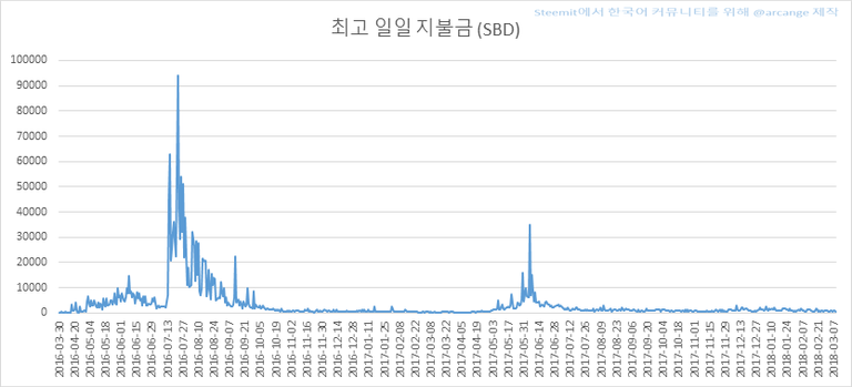 위의 그래프들은 1일간 최대 보상을 받은 포스트 (또는 댓글)의 금액을 보여줍니다 (블록체인 전체 기간과 지난 30일 간).