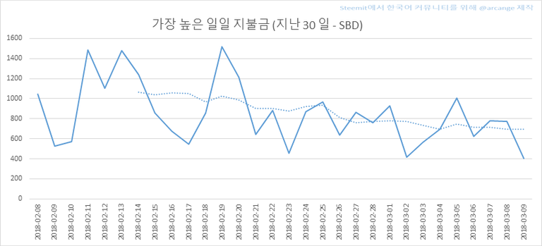 위의 그래프들은 지난 30일간 게시글당 평균 보상 금액과 중앙값(median payout)을 보여줍니다.