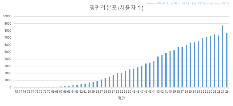이 그래프는 평판 수치에 따른 유저들의 분포도를 보여줍니다. 25 이하의 평판을 가진 유저들은 그래프에서 제거되었습니다.