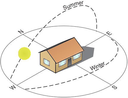 For solar light to enter the house, obviously you should build windows, the detail is: that should be built thinking that the sun appears in the east and goes to the west and that in summer the sun has a higher inclination than in winter. Let's see the following image ...