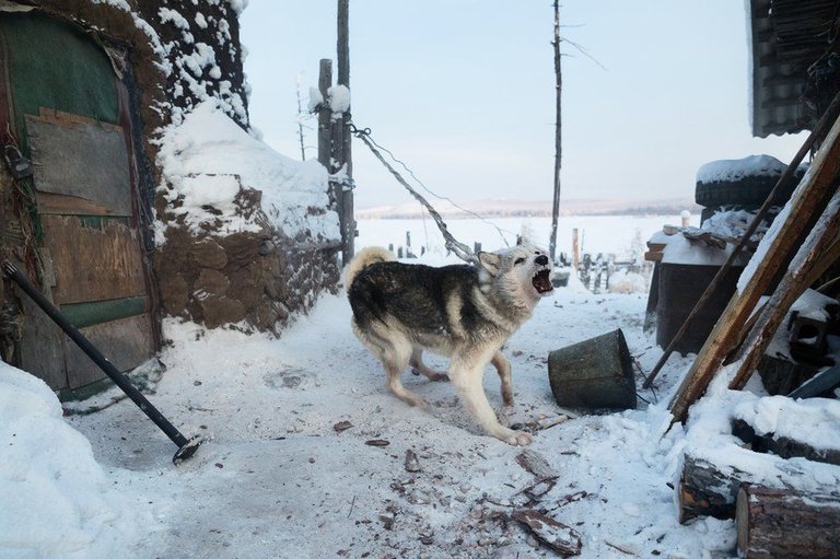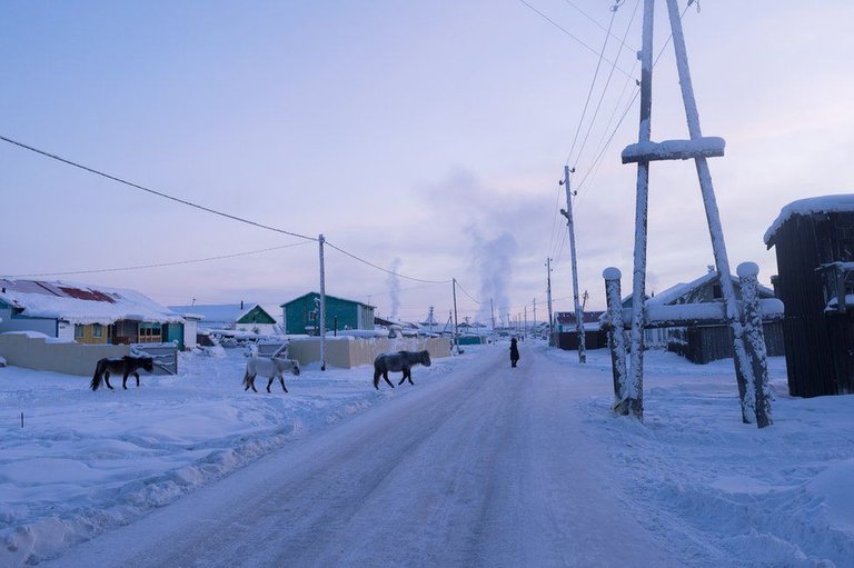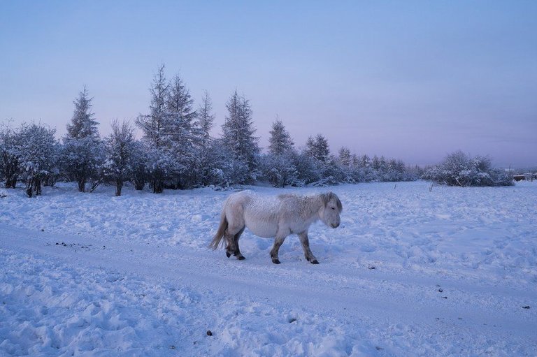 Armed with thick fur and a layer of fat grown during the autumn, the horses and the dogs of the village spend the winter outside in these freezing temperatures.