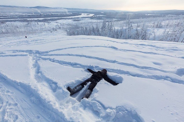 Ayal lays down in the snow on the heights of Verkhoyansk while waiting for his mother and some of her friends to come up the hill. The smoke coming out of the coal power stations of the village can be seen in the background.Image copyrightBRICE PORTOLANO