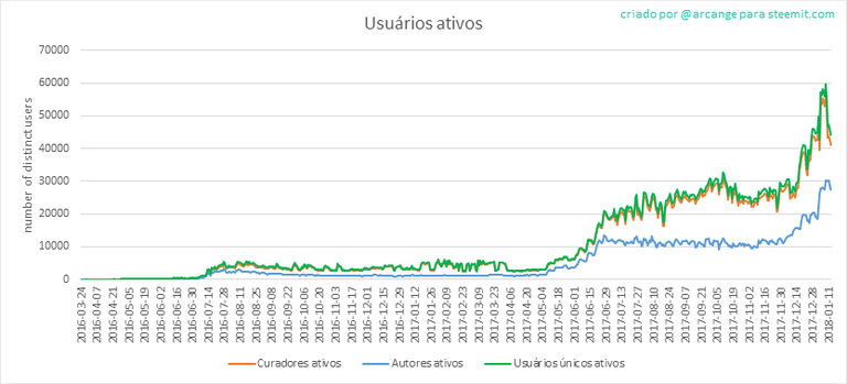 Esse gráfico mostra o numero de novos usuários registrados no Steemit e quantos destes permaneceram ativos. Nos vemos muitas contas registradas, porém não sendo utilizadas.
