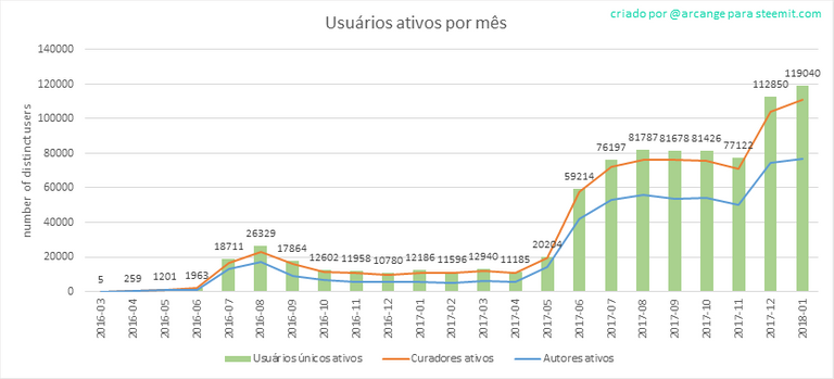 O último gráfico é um resultado mensal dos usuários ativos. Isso permite comparar o valor do Steemit's para aqueles que costumam postar em outras redes sociais.