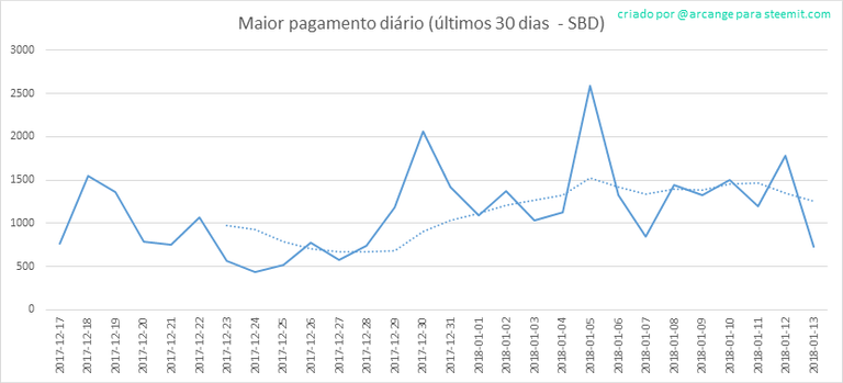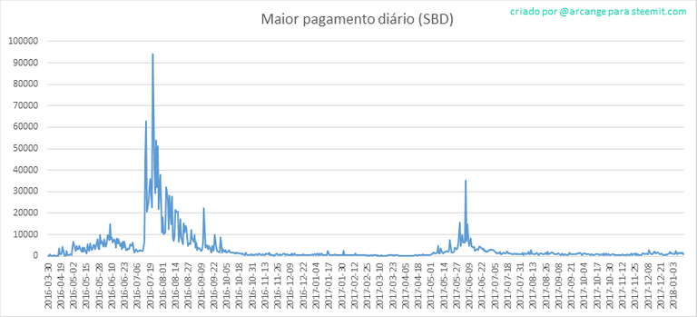Este gráfico mostra o máximo de recompensa pago por um post (ou comentário), em cada dia (durante todo funcionamento da blockchain e os últimos 30 dias)