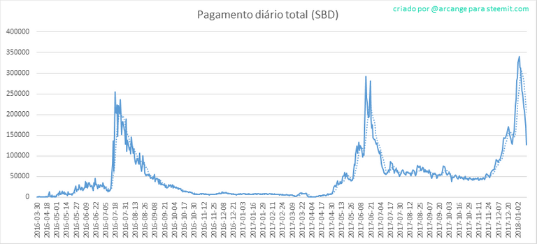 Este gráfico mostra o total de distribuicao de pagamentos (posts e comentários) por cada dia.