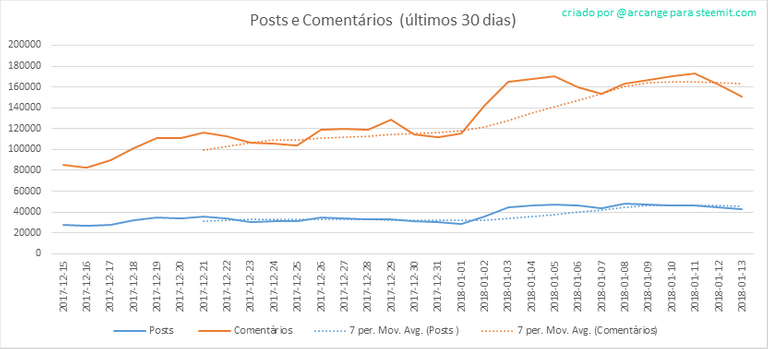 Esses gráficos mostram a evolução dos posts e comentários desde o início da blockchain e dos últimos 30 dias.