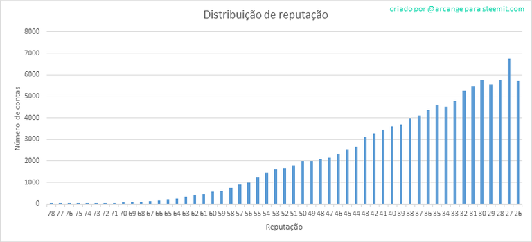 Este gráfico mostra a distribuição de reputação entre os usuários. Contas com reputação menor que 25 foram removidas do gráfico para melhor visualização.