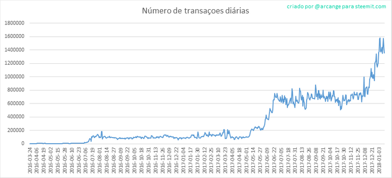Este gráfico mostra o número de transações diárias. Isto dá uma ideia de toda atividade na blockchain.