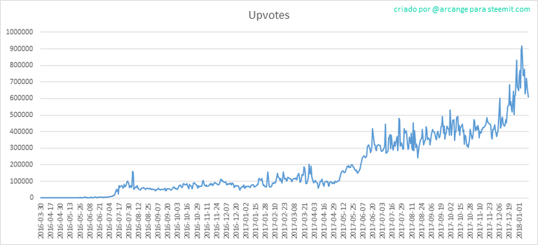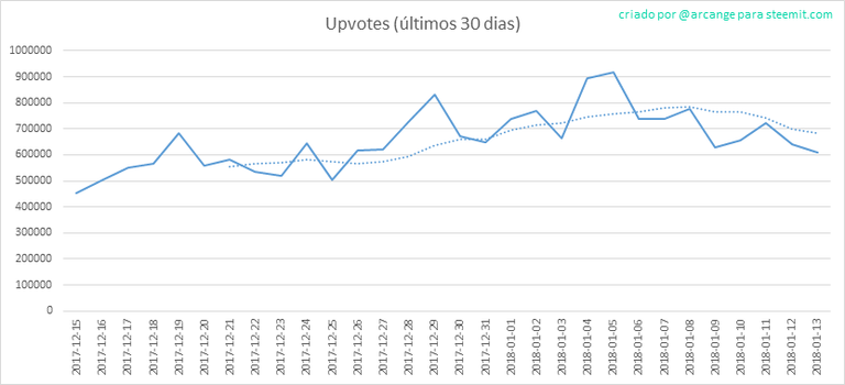Esses gráficos mostram a evolução da curadores (upvotes) desde o início do funcionamento da blockchain e dos últimos 30 dias.