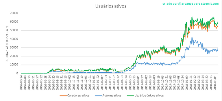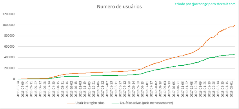 Esse gráfico mostra o numero de novos usuários registrados no Steemit e quantos destes permaneceram ativos. Nos vemos muitas contas registradas, porém não sendo utilizadas.