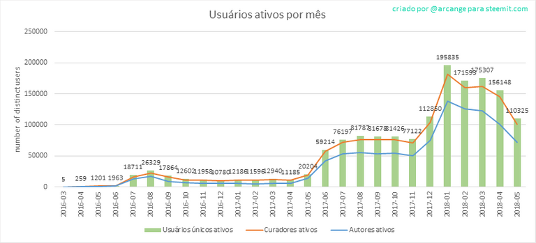 O último gráfico é um resultado mensal dos usuários ativos. Isso permite comparar o valor do Steemit's para aqueles que costumam postar em outras redes sociais.
