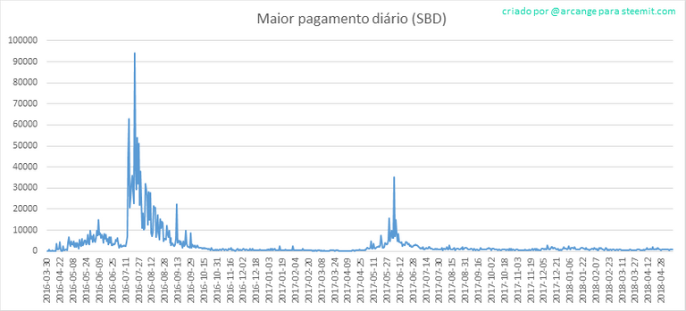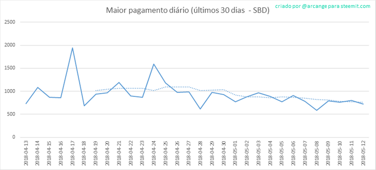 Este gráfico mostra o máximo de recompensa pago por um post (ou comentário), em cada dia (durante todo funcionamento da blockchain e os últimos 30 dias)
