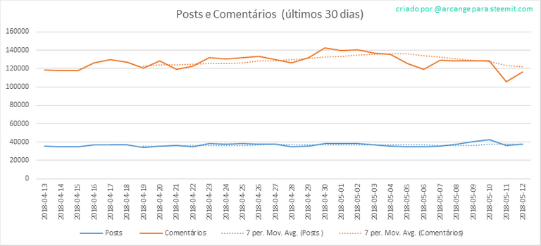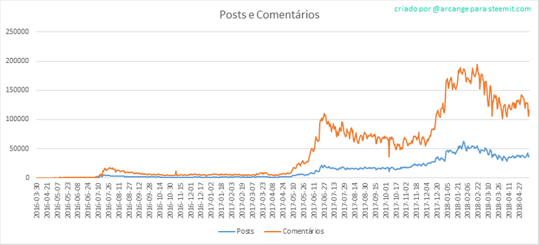 Esses gráficos mostram a evolução dos posts e comentários desde o início da blockchain e dos últimos 30 dias.