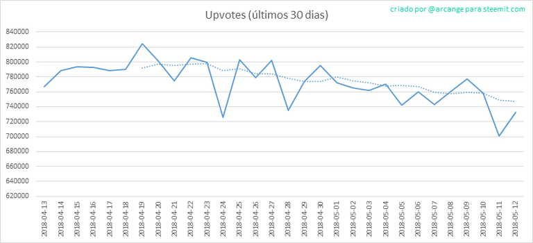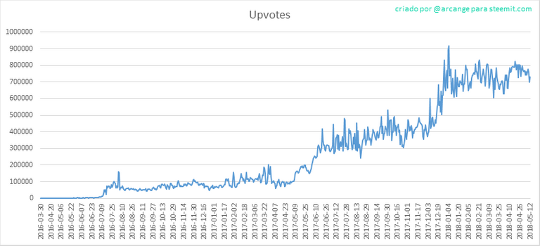 Esses gráficos mostram a evolução da curadores (upvotes) desde o início do funcionamento da blockchain e dos últimos 30 dias.