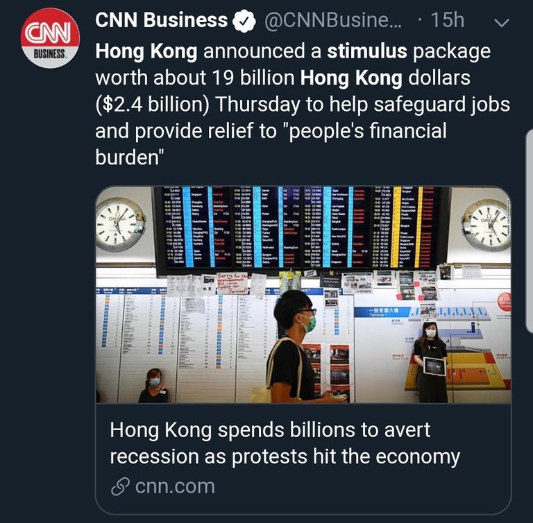 홍콩에서는 일자리를 안정화시키고 사람들의 재정 부담을 줄이기 위해 2.4빌리언달러 어치 경기부양책 공지