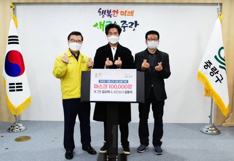 서울 중랑구가 9일, 중랑구 소재 봉제업체 성진상사(대표: 김동석)와 개그맨 김시덕으로부터 마스크 총 10만장을 전달받았다고 밝혔다.