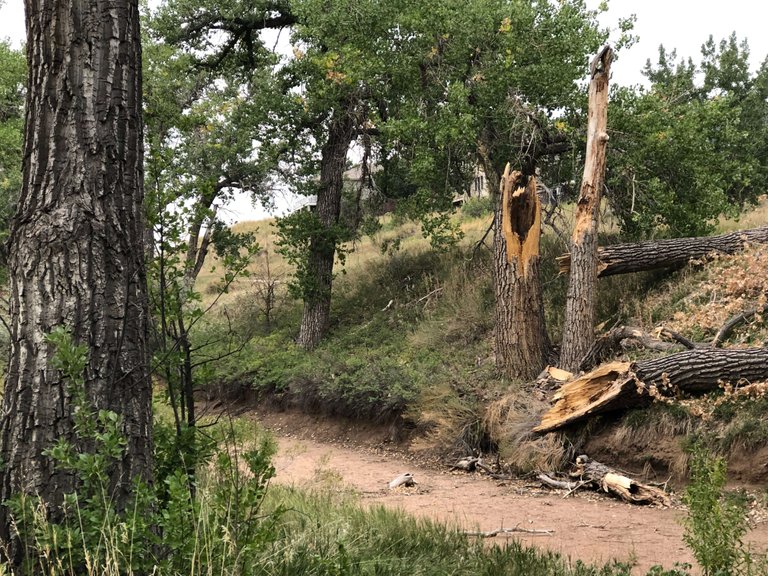 Took a walk along the dry creek bed and saw this huge Cottonwood tree. Not sure what caused it to break, looks like maybe lightning or just wind snapped it off. Had to be at least 100 feet tall.