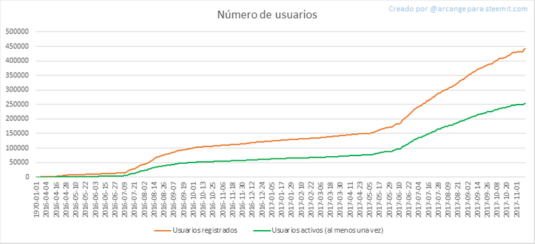 Este gráfico muestra el número de usuarios registrados recientemente en Steemit y cuántos de ellos se convirtieron en activos. Vemos que muchas cuentas se registran, pero nunca se usan.