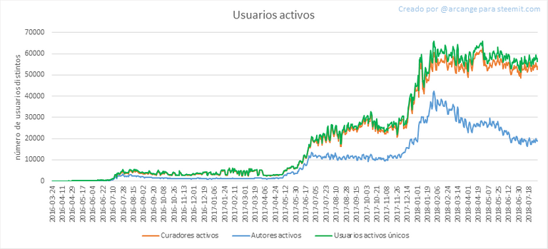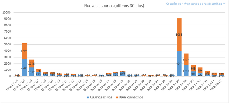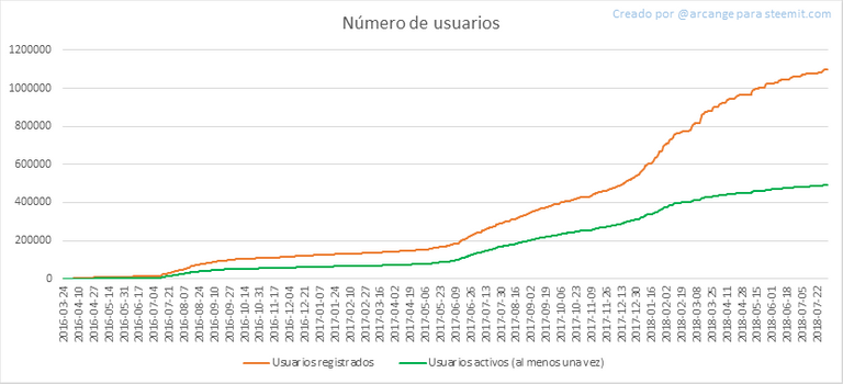 Este gráfico muestra el número de usuarios registrados recientemente en Steemit y cuántos de ellos se convirtieron en activos. Vemos que muchas cuentas se registran, pero nunca se usan.