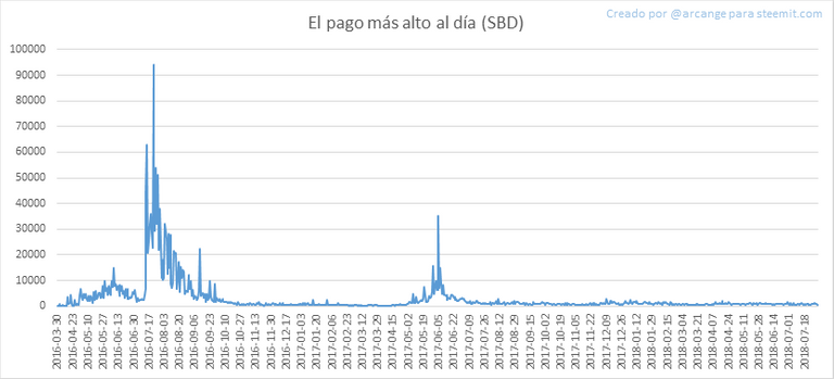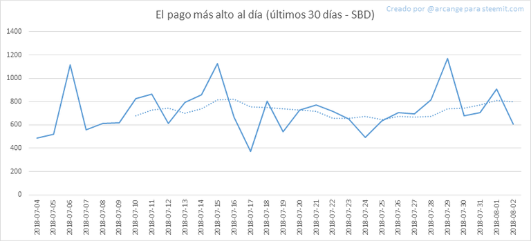 Estos gráficos muestran la recompensa máxima pagada en un post (o comentario) por cada día (duración de bloque completo y los últimos 30 días).