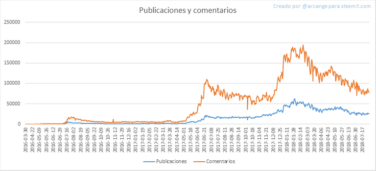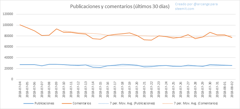 Estos gráficos muestran la evolución de las publicaciones y comentarios por el tiempo de vida útil de la blockchain y durante los últimos 30 días.