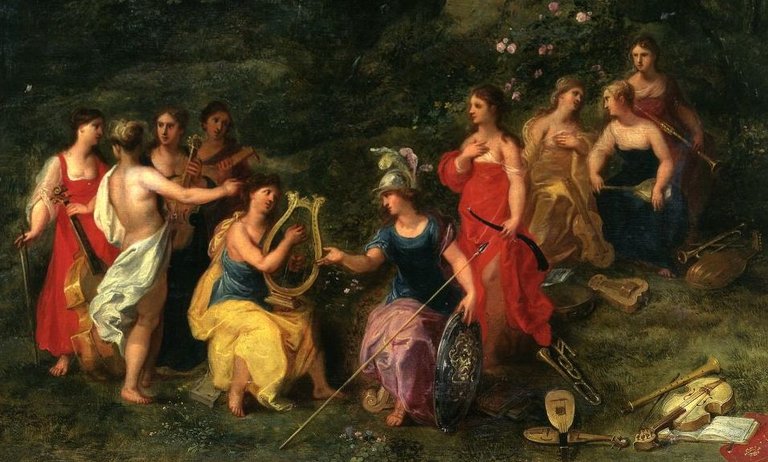 Atenea (Minerva) y las Nueve Musas inspiradoras. De la palabra «musa» proviene «música»