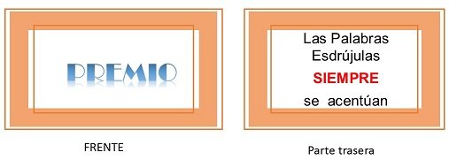 Luego yo les preguntaba a mis hijos: - ¿en donde debes colocar el acento?- y obviamente decían que en la última sílaba, entonces le regalas esta tarjeta que dice por delante la palabra PREMIO y por detrás dirá la Regla N°1: Las palabra aguda son aquellas que su sílaba tónica está en la última sílaba y solo se acentúan cuando terminen en vocal, "n" o en "s". y solo con esta tarjeta sabrán si debe colocar la tilde o simplemente dejarlo así.