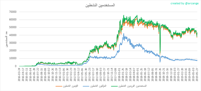 يعرض هذا المخطط عدد المستخدمين المسجلين حديثًا على blockchain وعددهم الذين أصبحوا نشطين. نرى أن الكثير من الحسابات مسجلة ، ولكن لم يتم استخدامها مطلقًا.