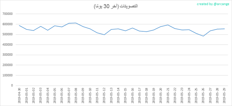 تظهر هذه الرسوم البيانية تطور التفاعل (upvotes) لكامل عمر blockchain وخلال ال 30 يوما الماضية.