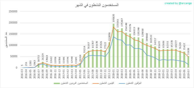 الرسم البياني الأخير هو ملخص شهري للمستخدمين النشطين. انها تسمح لك لمقارنة القيم من كتلة Steem إلى تلك المعتادة التي تنشرها الشبكات الاجتماعية الأخرى.