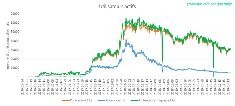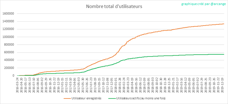 La ligne verte indique combien d'entre eux ont été actifs au moins une fois (par utilisateurs actifs, j'entends ceux qui ont fait au moins une publication, un commentaire ou une vote). Ils sont inclus même s'ils deviennent inactifs plus tard.