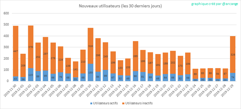 Attention: ce graphique est un peu dynamique! Un utilisateur peut s'inscrire un jour et ne devenir actif que quelques jours plus tard. Par conséquent, le nombre d'utilisateurs actifs à une date donnée peut varier d'un jour à l'autre.