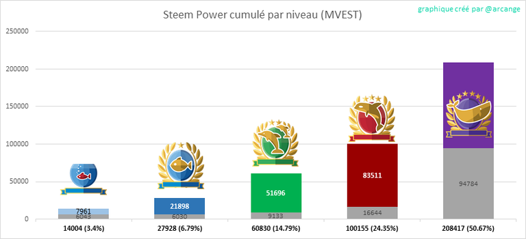 Ce graphique montre la distribution de Steem Power cumulée par niveau de compte.