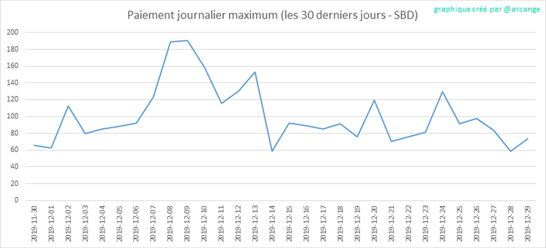 Ces graphiques montrent la récompense maximale payée sur un message (ou un commentaire) pour chaque jour (depuis la création de la blockchain et les 30 derniers jours).