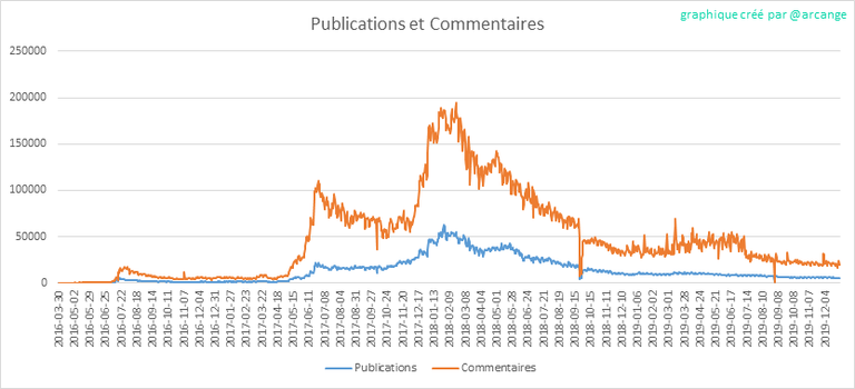 Ces graphiques montrent l'évolution des publications et des commentaires pour toute la durée de vie de la blockchain et pour les 30 derniers jours.