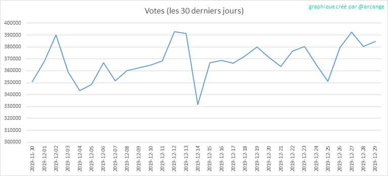 Ces graphiques montrent l'évolution de la curation (votes positifs) depuis la création de la blockchain et pour les 30 derniers jours.