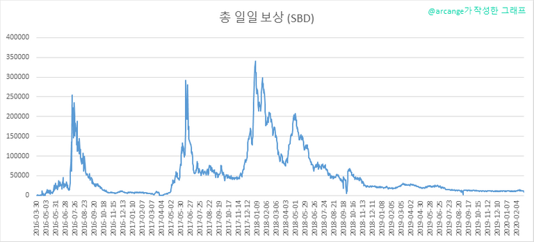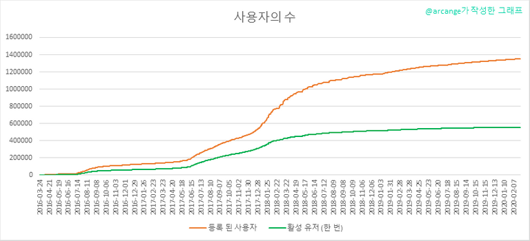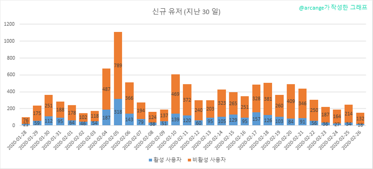 이 그래프는 스팀잇에 새로 가입한 유저 숫자와 그 중에서 얼마나 활성화가 되었는지 알려줍니다. 많은 유저들이 가입은 하지만, 실제로 사용되지는 않는다는 걸 볼 수 있습니다.