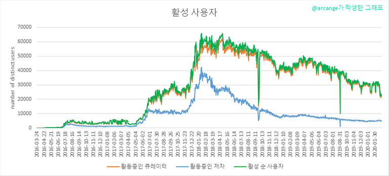 녹색선은 그 중 얼마나 많은 계정이 한번이라도 활성화 되었는지 나타냅니다. (활성화는 단 한번이라도 글, 댓글 또는 업보트를 한 계정을 말합니다.) 그들은 그들이 나중에 비활성화 될 경우에도 포함되어 있습니다.