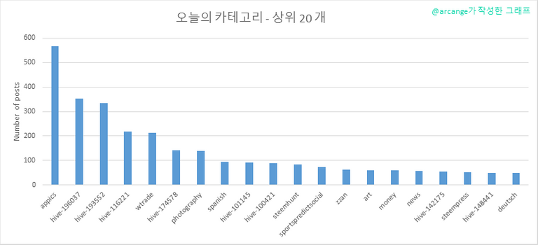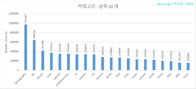 이 그래프는 전체 기간 중 상위 20개 카테고리의 게시글 숫자를 보여줍니다.