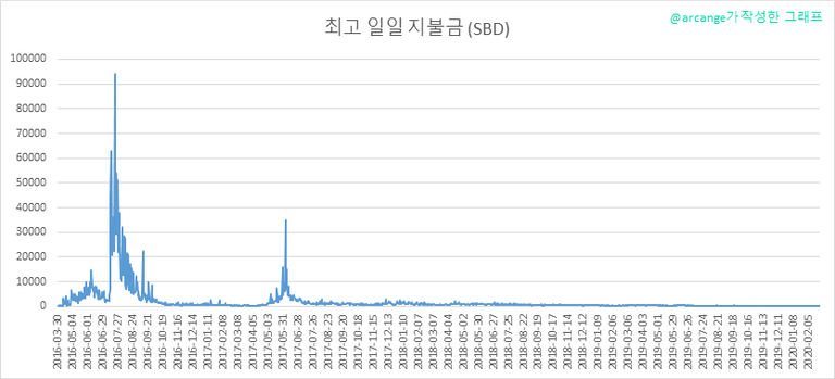위의 그래프들은 1일간 최대 보상을 받은 포스트 (또는 댓글)의 금액을 보여줍니다 (블록체인 전체 기간과 지난 30일 간).