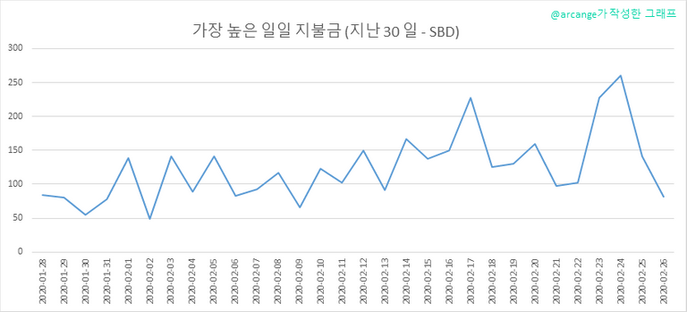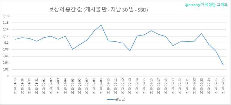 위의 그래프들은 지난 30일간 게시글당 평균 보상 금액과 중앙값(median payout)을 보여줍니다.