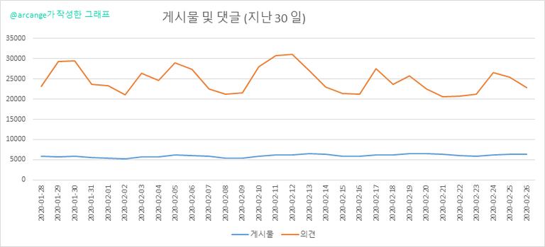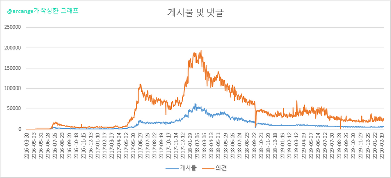 위의 두 개의 그래프는 블록체인 전체 기간과 지난 30일간의 포스트와 댓글 수를 보여줍니다.
