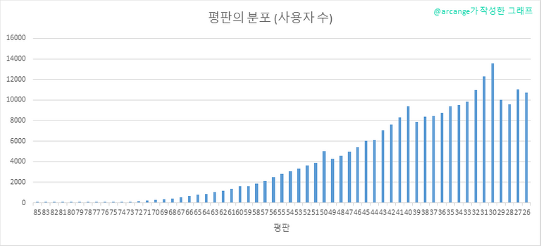 이 그래프는 평판 수치에 따른 유저들의 분포도를 보여줍니다. 25 이하의 평판을 가진 유저들은 그래프에서 제거되었습니다.