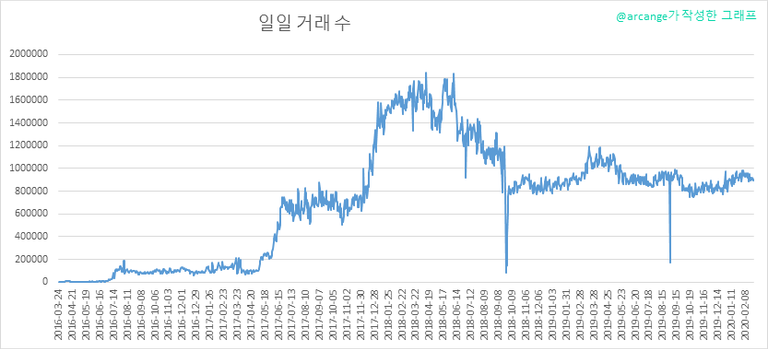 위의 그래프는 일간 트랜잭션 수를 보여줍니다. 이 그래프를 통해 블록체인의 전체 활동에 대한 아이디어를 얻을 수 있습니다.