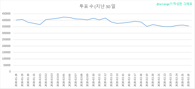 위의 두 개의 그래프는 블록체인 전체 기간과 지난 30일간의 큐레이션 (upvotes) 수를 보여줍니다.